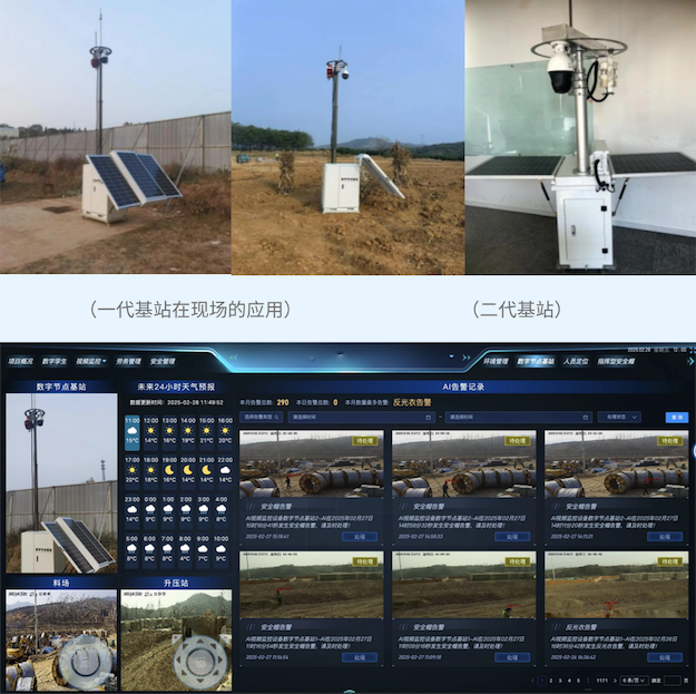 针对山东院某光伏发电项目处偏远地区无网络覆盖的痛点,浩联自研的数字节点基站实现了局域网下的数据采集、本地化分析与断点续传,基站集环境监测、视频监控、AI分析、进度管理、人员定位等功能于一体,内置的AI算法在此无网光伏项目上,实现了数据分析后联动本地音柱报警,有效解决了无网环境数据采集难,管控不及时的问题。