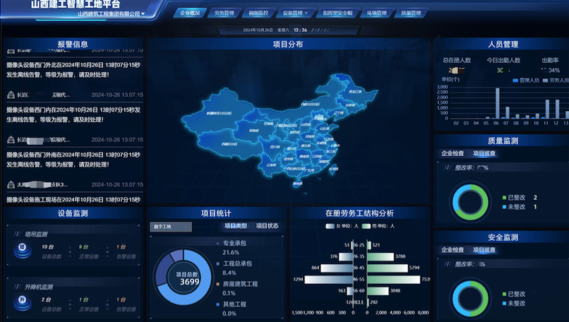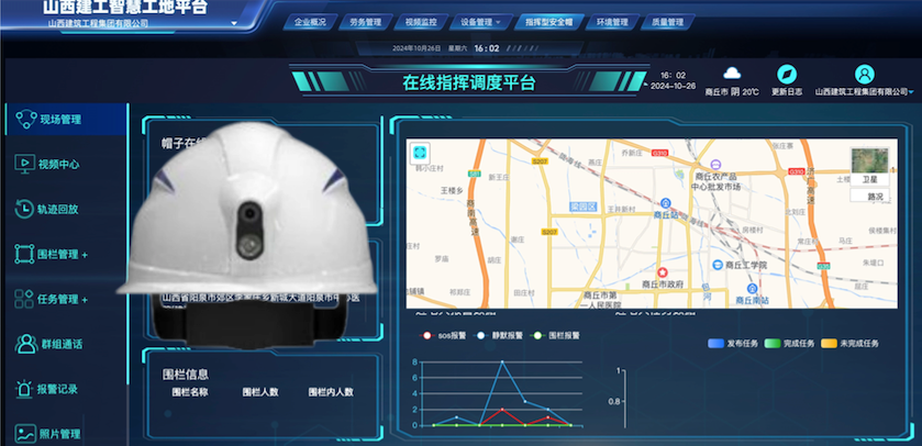 通过D6C企业级智能建造平台,远程监管施工现场的人员状况、视频监控情况、双防双控工作、指挥型安全帽的使用以及特种作业设备的运行状况;在获取决策依据的基础上进行指挥调度。