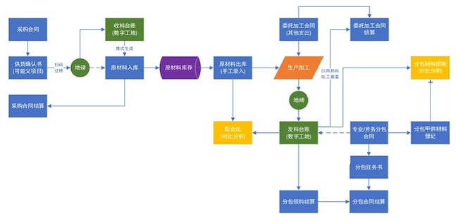 i8确定供货合同,供方在D6C小程序中填发货单并生成二维码,进场过磅时,项目部现场扫描二维码自动带入合同相关信息进行自动称重,实现现场收料数据与合同数据自动对比,判定供应商的供货行为并预警;拌合站发料时通过自动获取出场称重数据,根据D6C中预填的生产配合比自动判定原材料投入偏差同时相关数据作为成本管理要素回归到i8中。