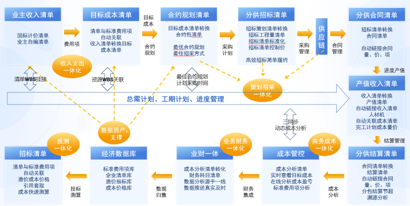与财务、云筑网等关键系统深度集成,实现数据标准化、结构化拉通与共享,全面支撑业务财务一体化管控。