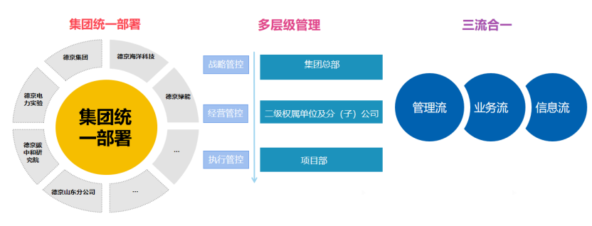 通过集团统一部署,满足集团总部、二级权属单位及分子公司、项目的三级管理需求,同时满足不同层级不同管理颗粒度的战略管控、经营管控、执行管控目标,依托新中大项目管理平台,将项目经营管理、项目生产管理、企业经营管理有机融合,满足德京集团新时期的管理需求,建立一个支撑集团业务发展和管控变革的经营管理平台,支持集团优化运营和加强管控,建立以项目管理为核心的一体化的信息系统,辅助提升德京集团的综合运营管控能力。