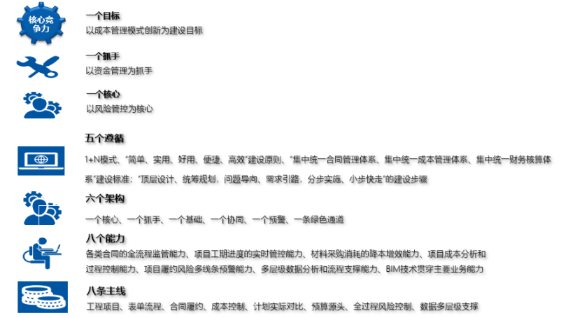 以“1+1+1+5688”建设原则,树立信息化是企业核心竞争力的理念,把智能建造一体化管控服务平台建设作为企业管理转型升级的唯一途径,视为公司一次管理领域的革命。建立适合公司需要的以业务、财务、税务、资金融合为主要内容,以BIM模块化应用为支持的规范、清晰、可行、可控的项目管理系统,以前端起于市场营销、合同评审和输入、末端止于支付为主线,全过程利用信息化手段固化核心制度、规范管理流程、压实职能职责,提高管理效率和管理执行力。