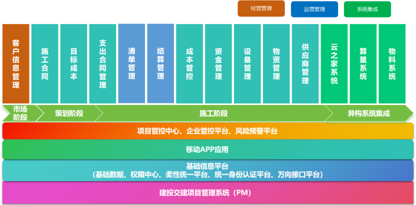 构建以成本管控为核心、合同管控为基础的综合性管理平台,以项企融合作为关键实施策略,资金管控为执行抓手,全面整合项目全生命周期管理价值链。确保数据纵向深入贯通与横向广泛联动,使业务流程紧密贴合实际需求,高效运行。内置风险预警机制,构建闭环管控体系,以精细化管理和高效运营为引擎,持续驱动公司稳健健康发展。