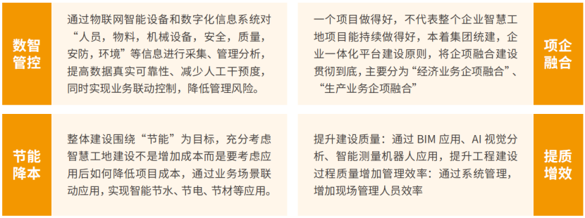 建筑业正通过智能建造技术减少能耗和碳排放,提高能效和环保性,以应对气候变化和资源限制。国家政策和企业内控促进了智能建造平台的发展,旨在提升项目管理效率、降低成本、优化资源配置和确保安全。中电建建筑提出“数智管控、节能降本、企项融合、提质增效”的建设目标,并以“114362”规划为指导,实现“四大融合”理念,打造深度融合的企业级智能建造管理平台,实现业务统一和远程调度。