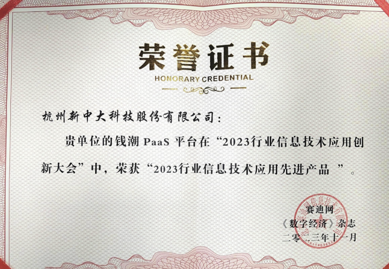 新中大“钱潮PaaS平台”荣获“2023行业信息技术应用先进产品”荣誉
