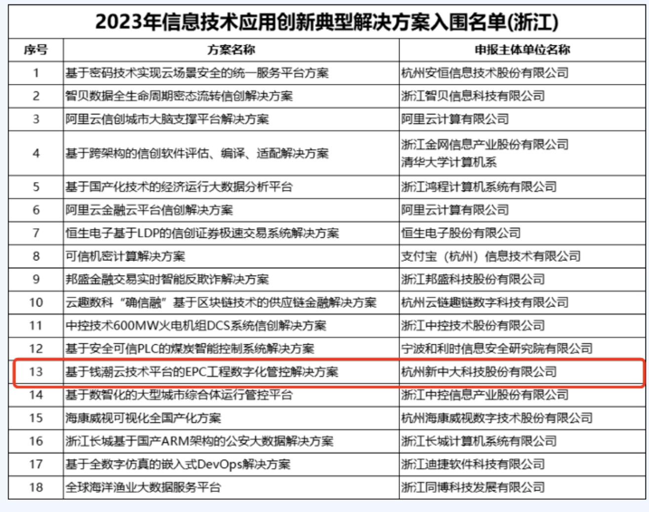 近日,工业和信息化部通报了2023年信息技术应用创新解决方案征集遴选结果,本次共评选出典型解决方案173个、应用示范案例83个、单项创新案例64个。其中,新中大科技凭借“基于钱潮云技术平台的EPC工程数字化管控解决方案”的创新应用成果,成功入围工信部”2023年信息技术应用创新解决方案”名单。这也是继今年1月新中大“智能建造工业互联网平台”应用入选工信部“工业互联网平台创新领航应用案例”之后,相关解决方案再一次实力入围工信部权威推介名单。