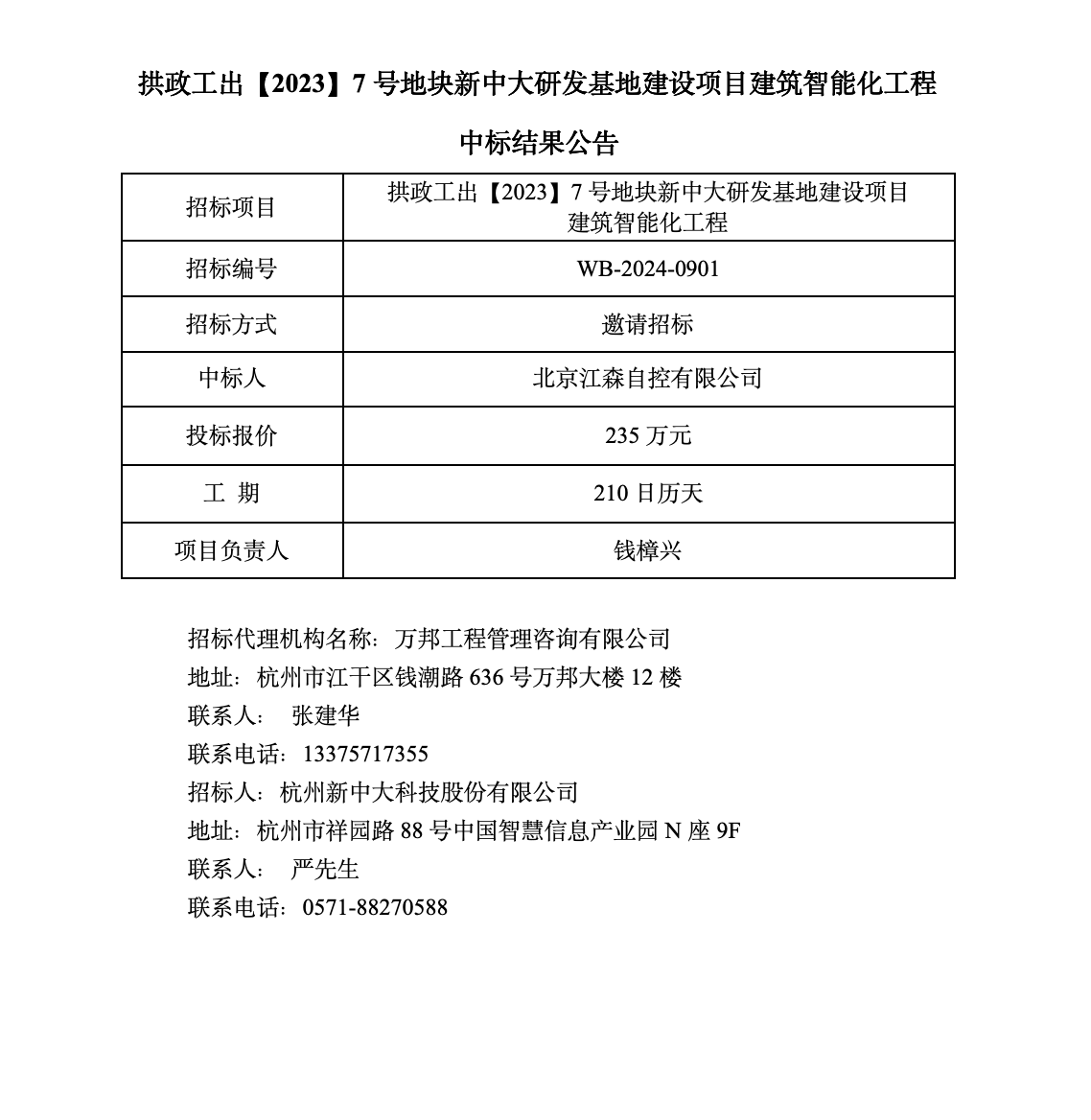 拱政工出【2023】7号地块新中大研发基地建设项目建筑智能化工程 中标结果公告