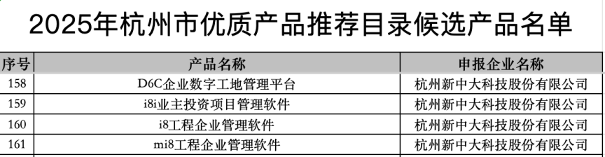 近日,杭州市经济和信息化局公布了《2025年杭州市优质产品推荐目录候选产品名单》。凭借卓越的技术实力与创新能力,新中大科技旗下四款产品D6C企业数字工地管理平台、i8i业主投资项目管理软件、i8工程企业管理软件以及mi8工程企业管理软件上榜名单。