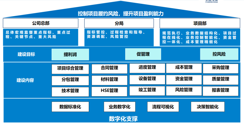 与此同时, 中国水电四局所属上级集团中国电建集团数字化建设步伐也不断加快,以PRP、财务共享、集采平台、云供应链平台、固定资产系统、大型机械等为核心的ERP生态系统要实现深度融合,同时市场对企业管理的要求越来越高,市场竞争日益激烈,而竞争机制的不够完善造成了企业为了拿到一项工程施工任务,不得不在投标过程中采取“压价”“低利”,甚至“无利”的方式参加竞标,致使招投标工程价格偏低,企业经济效益下滑,甚至严重危及企业的生存和发展,如何适应外部环境变化来调整自己的营销策略,如何进一步以建设优质工程、提供优良服务,以极具竞争力的价格获得订单已迫在眉睫。在强手如林的竞争对手面前,价格竞争的优势是企业获取工程建设项目的关键,这就迫使经营者把加强成本核算体系和工程管控体系的建设放在重要的位置。公司对内部的精细化、规范化、信息化管理的需求日趋强烈,整合公司资源,提升公司的核心竞争力,重新构建一套适应和促进公司发展需要的项目管理数字化系统已经迫在眉睫。