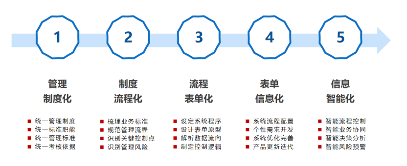五化融合、确保制度和流程深度融合,项目管理系统建设将固化业务流程,指引业务执行,提升业务规范性,打通纵向跨层级和横向跨部门间的协同,减少协作中的障碍和摩擦。