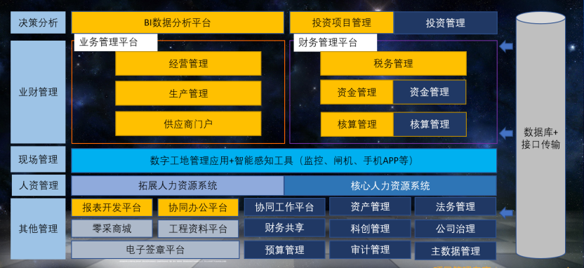 针对结算难、回款慢、多角债、“两金”高等难题,首钢建设需要对全业务流程进行梳理,建立一个支撑集团业务发展和管控变革的经营管理平台,支持集团优化运营和加强管控,建立以成本管控为核心的财务业务一体化的信息系统,辅助提升首钢建设的资源配置能力及运营管控能力。以数据标准化及系统集成化工作为基础,实现“成本管控、资金集中、采购集中”。
